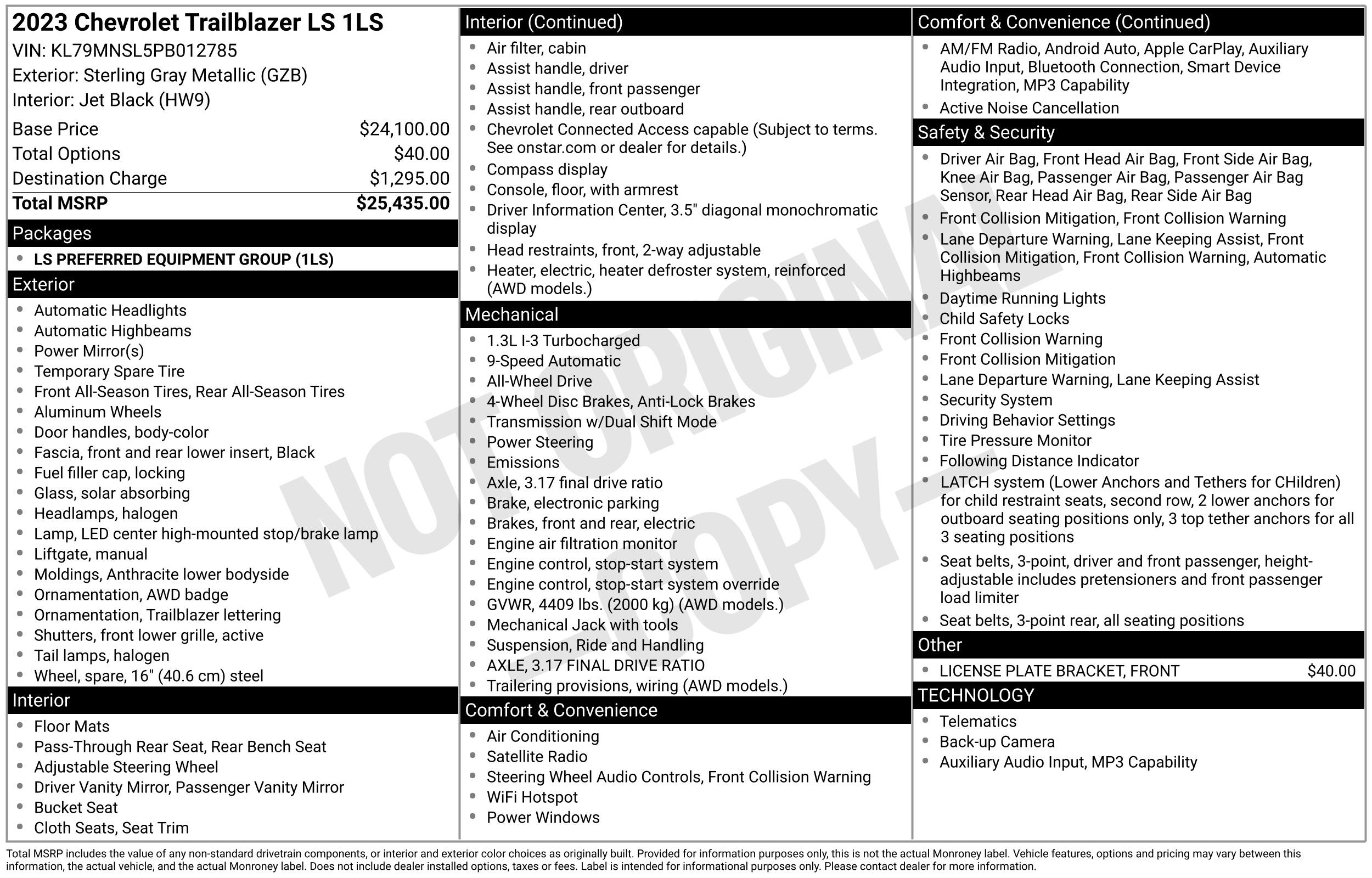 • VIN # KL79MNSL5PB012785